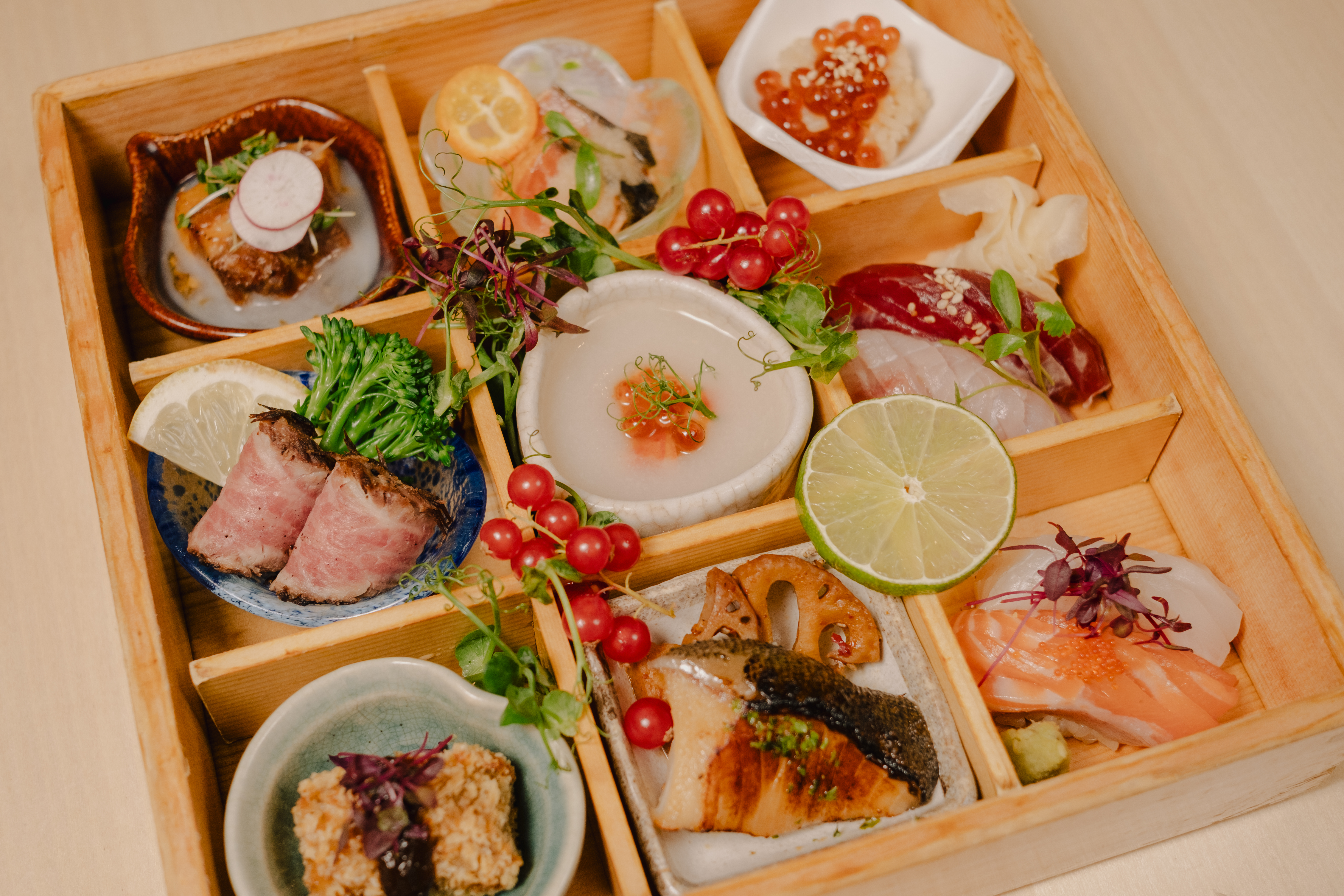 A traditional Japanese box used to beautifully present seasonal dishes for special occasions. Served with miso soup and pickled vegetables.